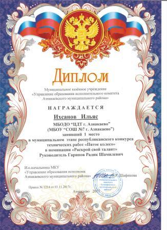 2 место в муниципальном конкурсе технического творчества «Технарь» (Богданов А., Валиев Д.Р.)