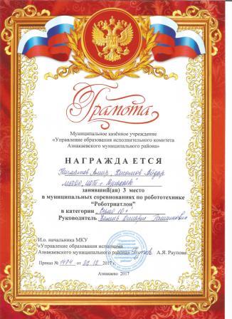 3 место в муниципальных соревнованиях по робототехнике «Роботриатлон – 2» (Богданов А., Валиев Д.)