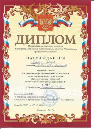 1 место в муниципальных соревнованиях по шахматам на личное первенство (Галиева Э., Салихов С.А.)