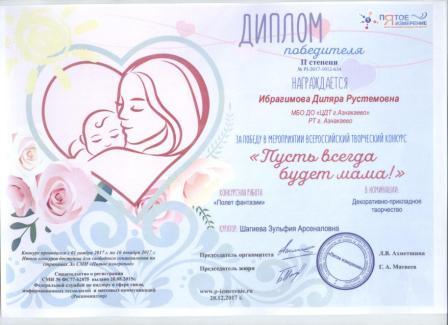 2 место во Всероссийском творческом конкурсе «Пусть всегда будет мама!» (Ахметова А., Шагиева З.А.)