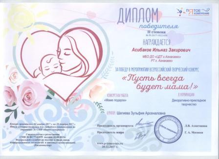 2 место во Всероссийском творческом конкурсе «Пусть всегда будет мама!» (Асибаков И., Шагиева З.А.)