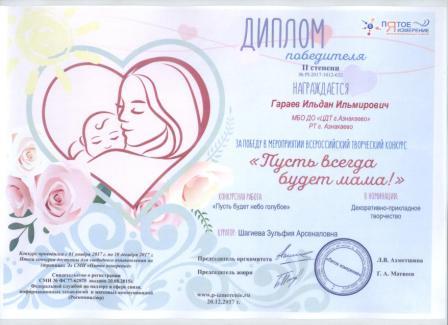 2 место во Всероссийском творческом конкурсе «Пусть всегда будет мама!» (Гараев И., Шагиева З.А.)