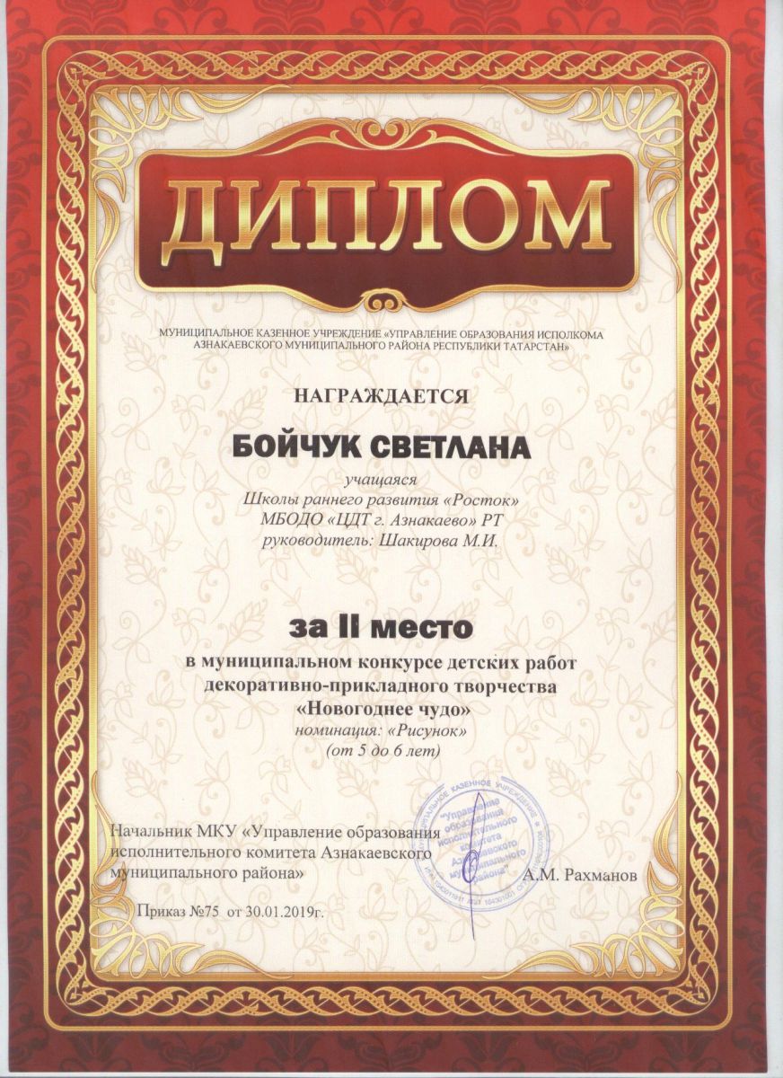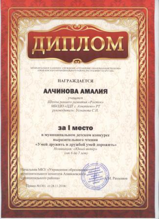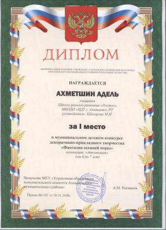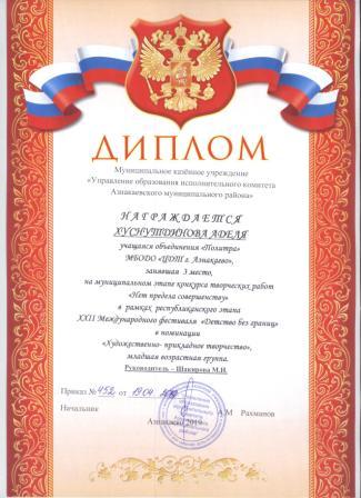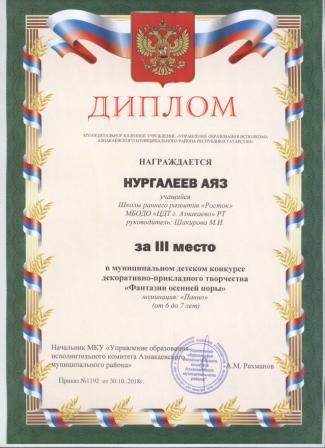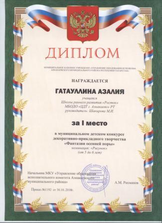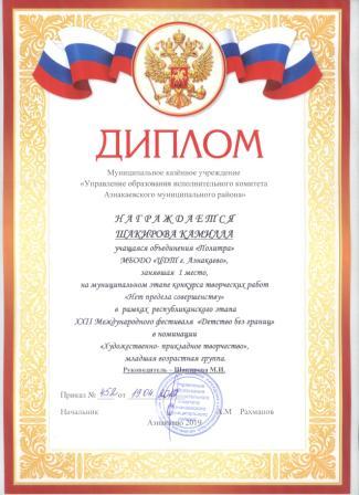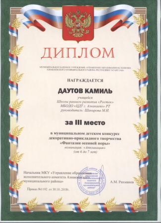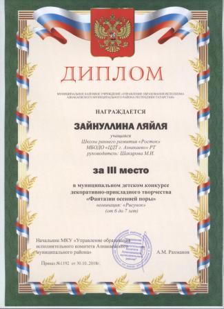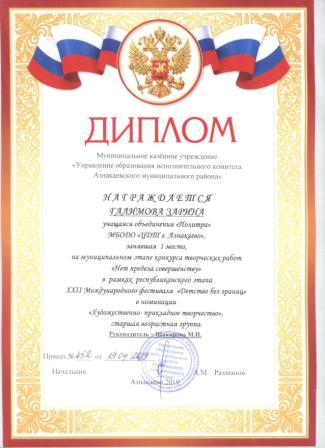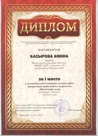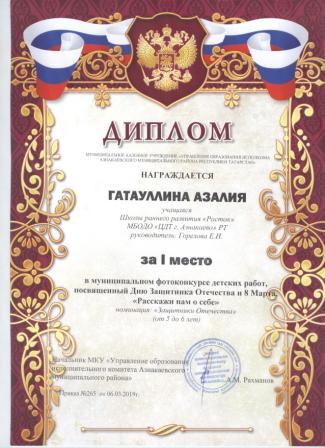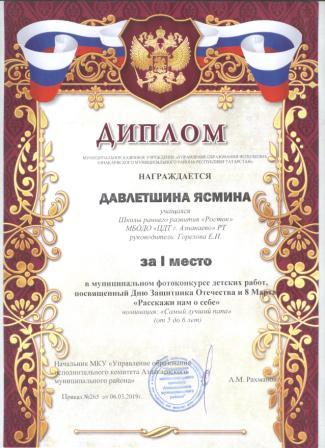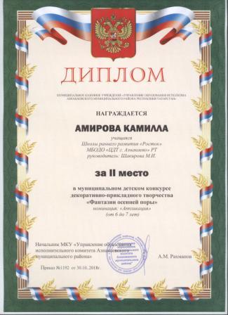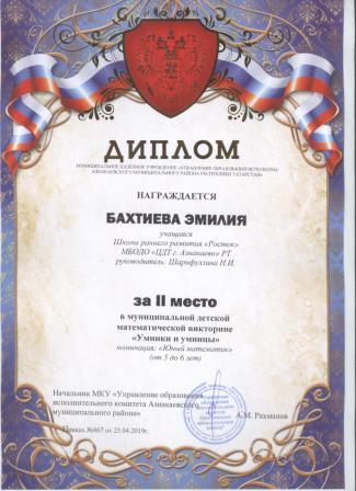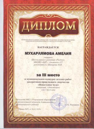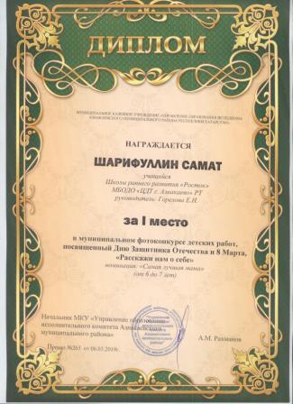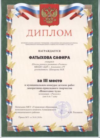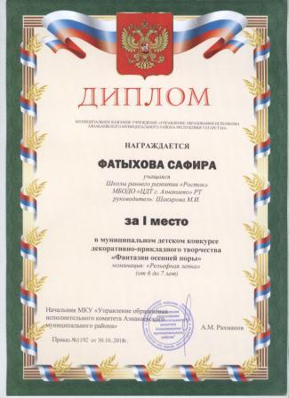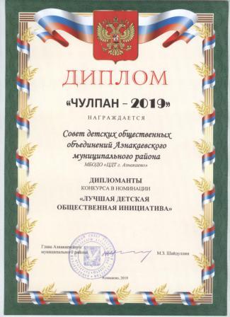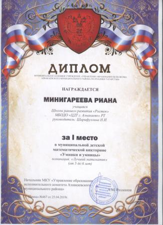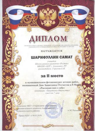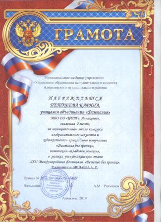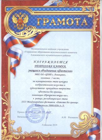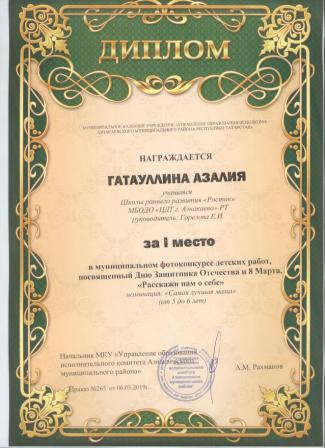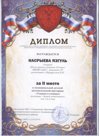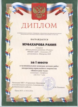 Дипломант мунципальной премии "Чулпан - 2019" (Объединение "Кедр", Гильманова М.Ш.)