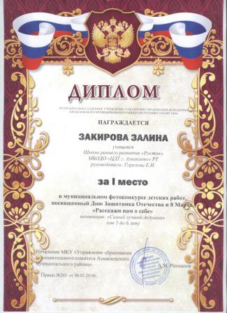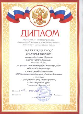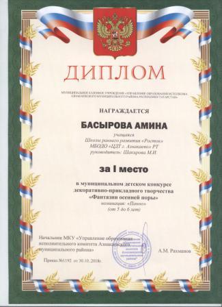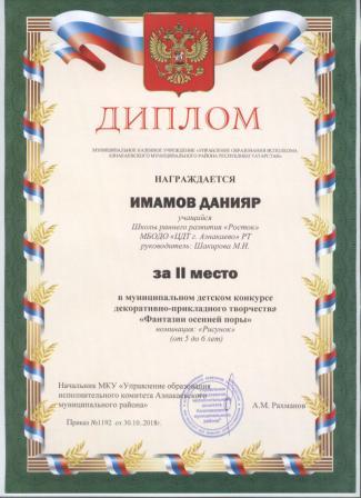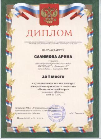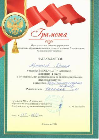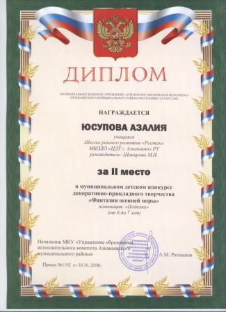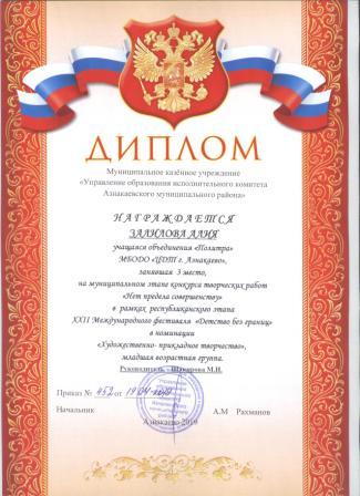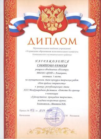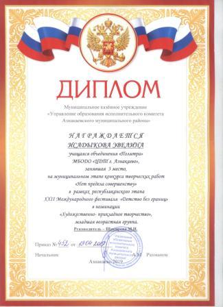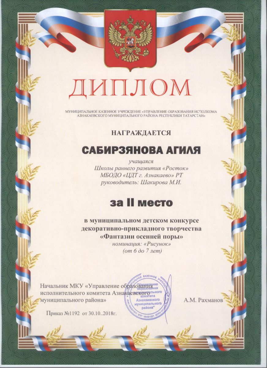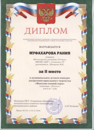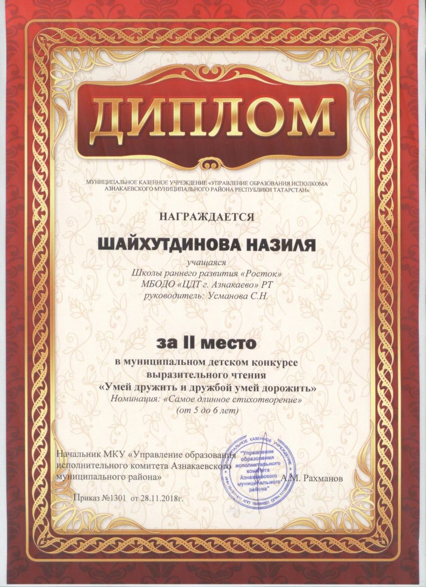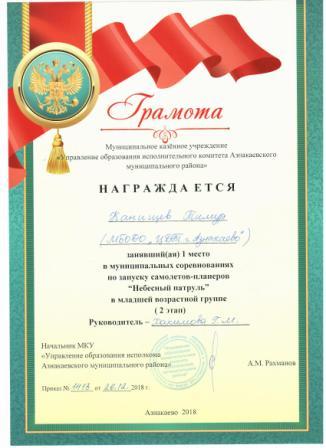 Дипломант мунципальной премии "Чулпан - 2019" (Объединение "Кедр", Гильманова М.Ш.)
