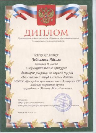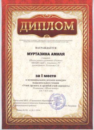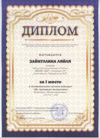 1 место в муниципальном детском конкурсе «По тропинкам математики» (Зайнуллина Л., Шарифуллина Н.И.)