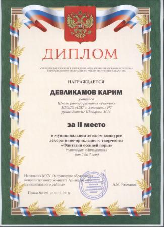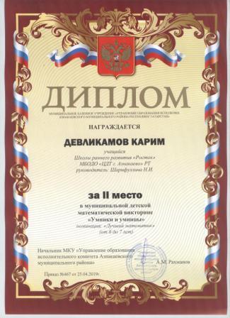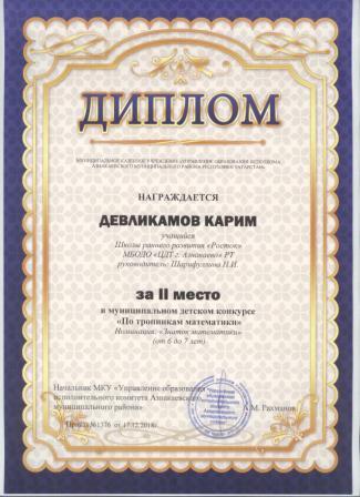 2 место в муниципальном детском конкурсе «По тропинкам математики» (Девликамов К., Шарифуллина Н.И.)
