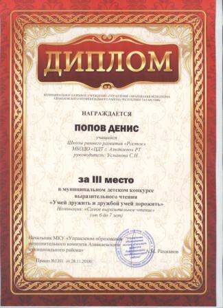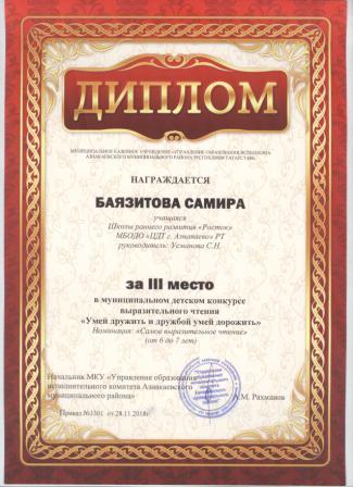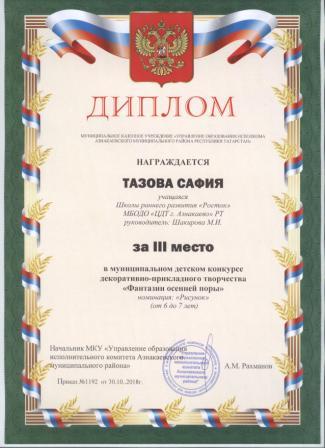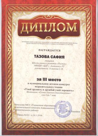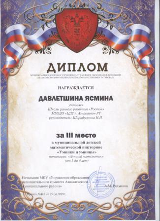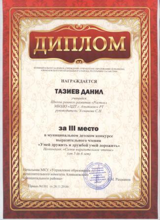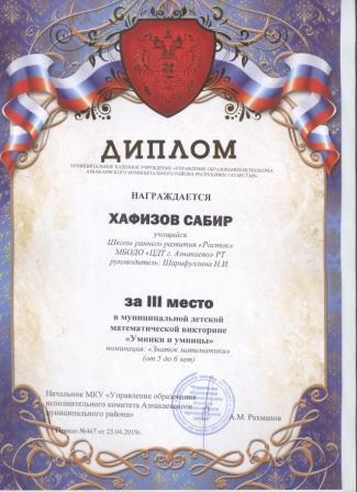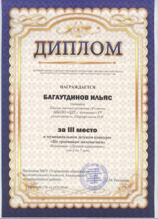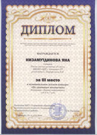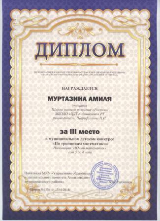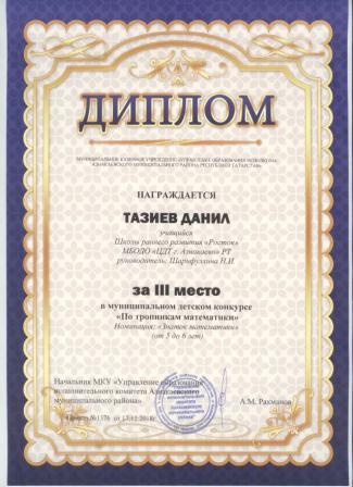 3 место в муниципальном детском конкурсе «По тропинкам математики» (Тазиев Д., Шарифуллина Н.И.)