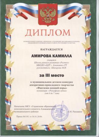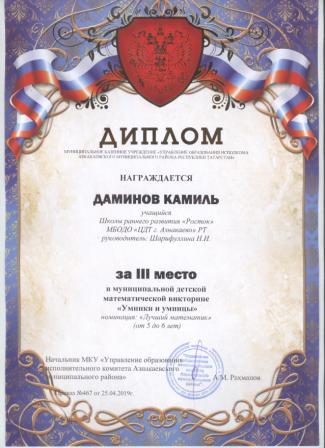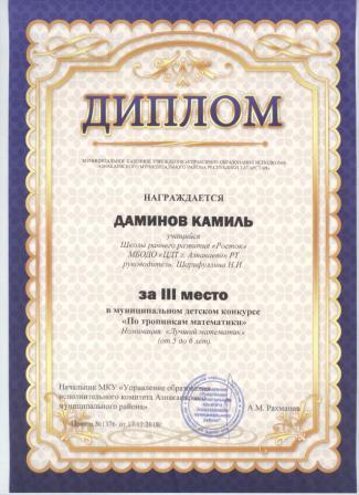 3 место в муниципальном детском конкурсе «По тропинкам математики» (Даминов К., Шарифуллина Н.И.)