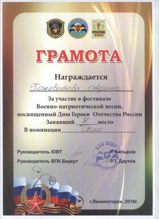 2 место в мунципальном конкурсе военно-патриотической песни (Кожеватова А., Стрих Р.Р.)