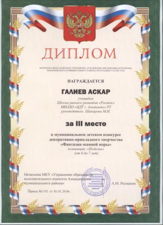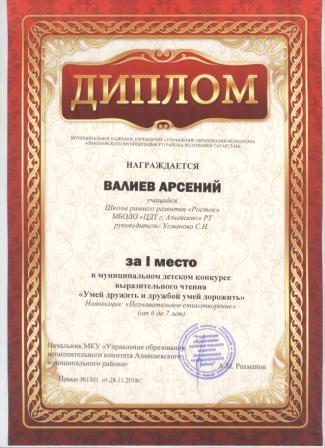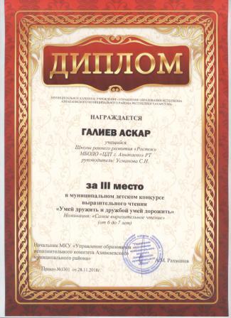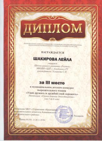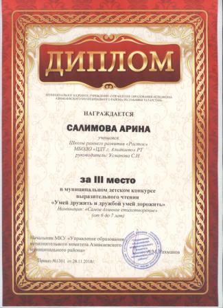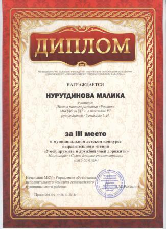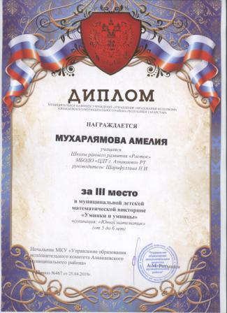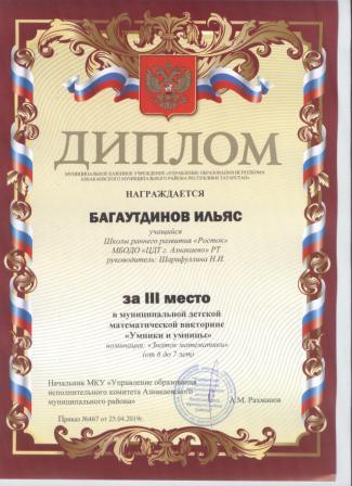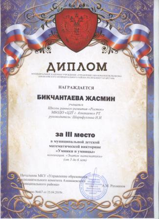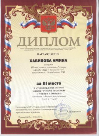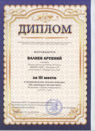 3 место в муниципальном детском конкурсе «По тропинкам математики» (Валиев А., Шарифуллина Н.И.)