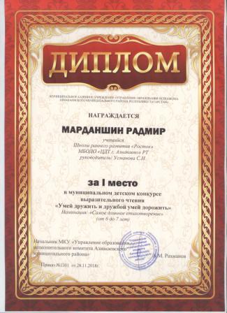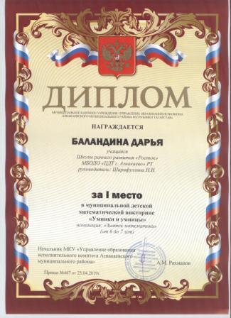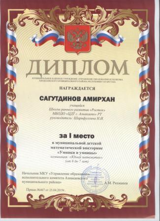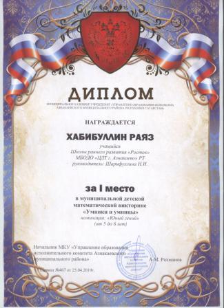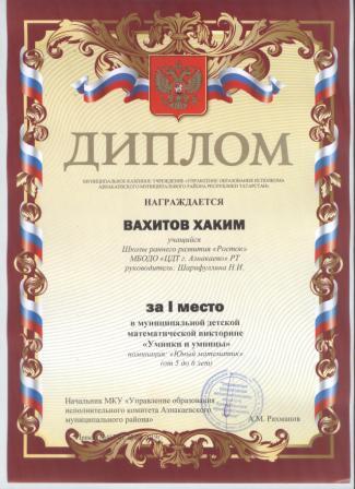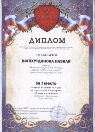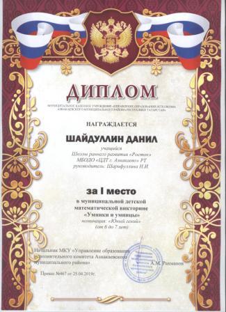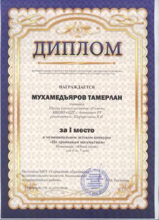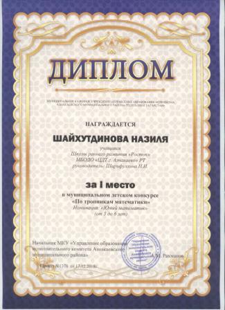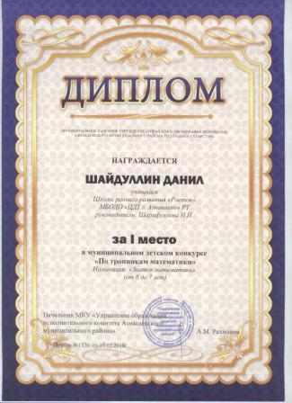 1 место в муниципальном детском конкурсе «По тропинкам математики» (Шайдуллин Д., Шарифуллина Н.И.)