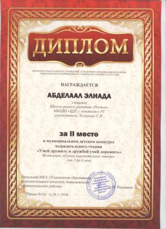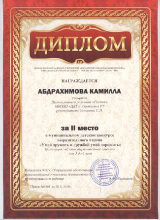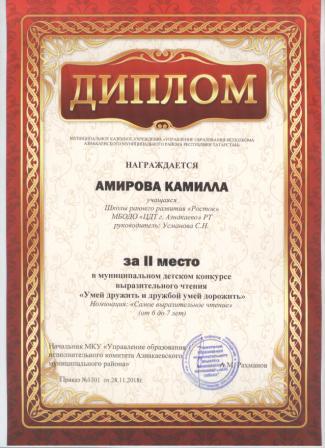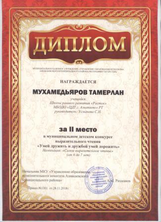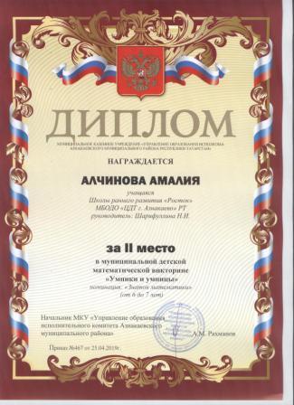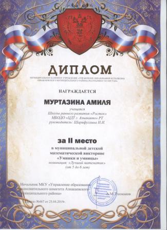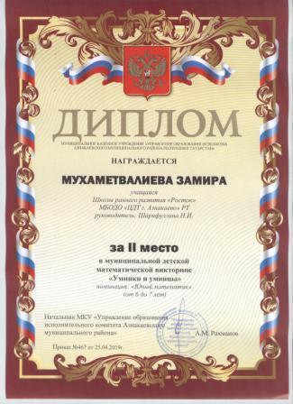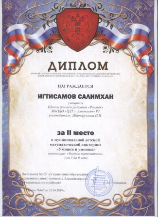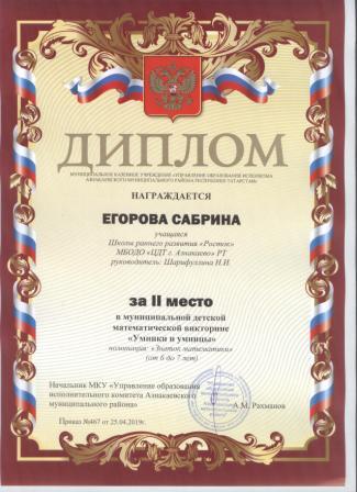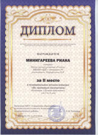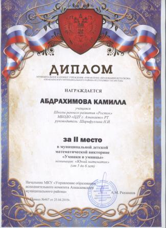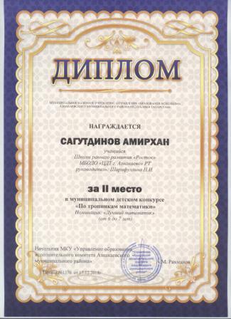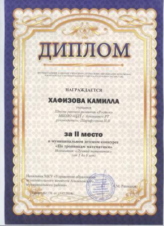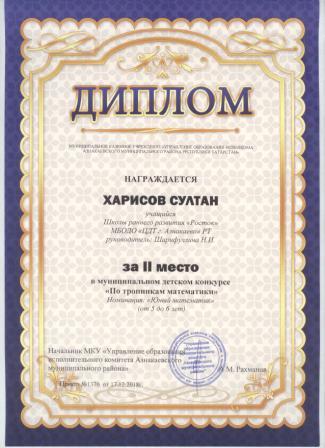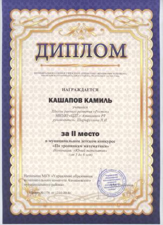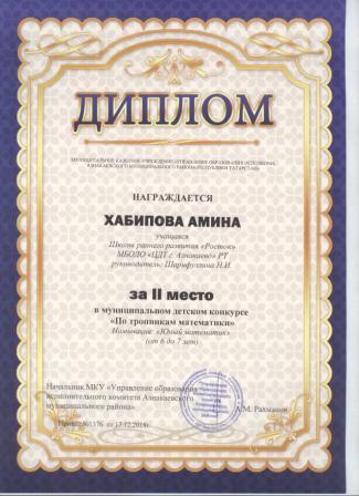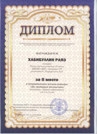 2 место в муниципальном детском конкурсе «По тропинкам математики» (Хабибуллин Р.. Шарифуллина Н.И.)