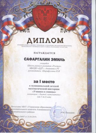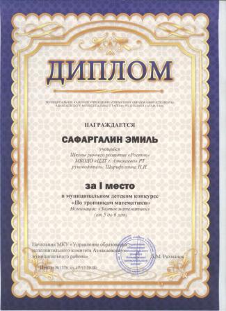 1 место в муниципальном детском конкурсе «По тропинкам математики» (Сафаргалин Э., Шарифуллина Н.И.)