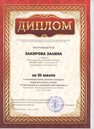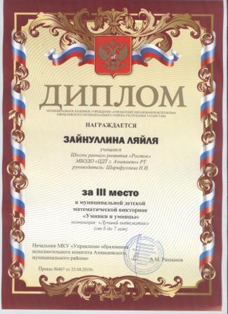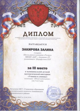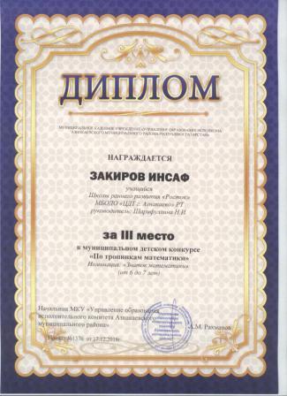 3 место в муниципальном детском конкурсе «По тропинкам математики» (Закиров И., Шарифуллина Н.И.)