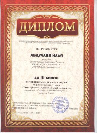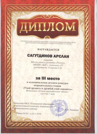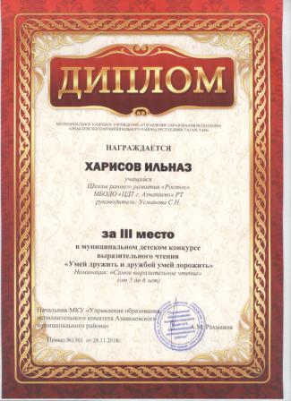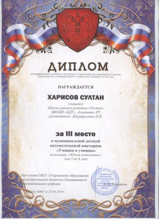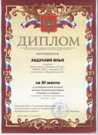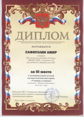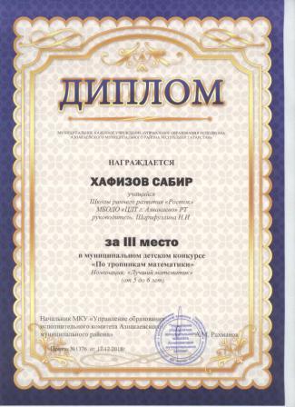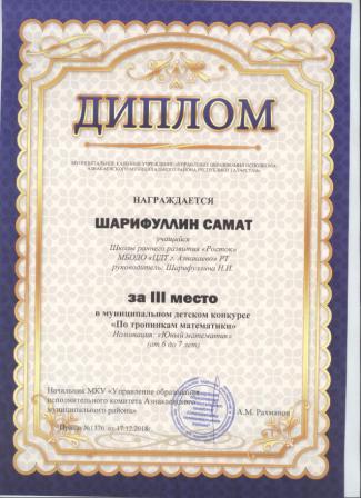 3 место в муниципальном детском конкурсе «По тропинкам математики» (Шарфуллин С., Шарифуллина Н.И.)
