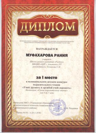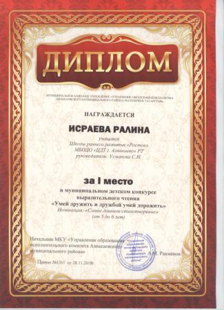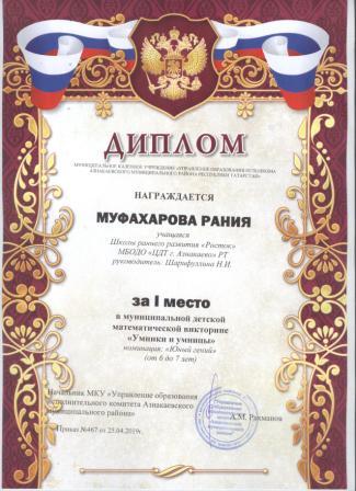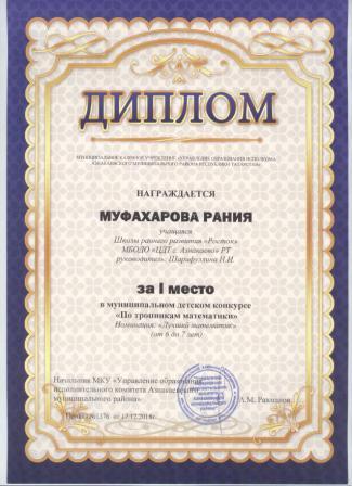 1 место в муниципальном детском конкурсе «По тропинкам математики» (Муфахарова Р., Шарифуллина Н.И.)