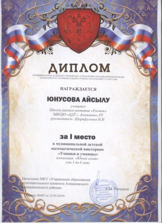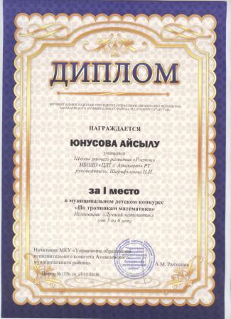 1 место в муниципальном детском конкурсе «По тропинкам математики» (Юнусова А., Шарифуллина Н.И.)