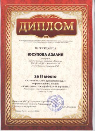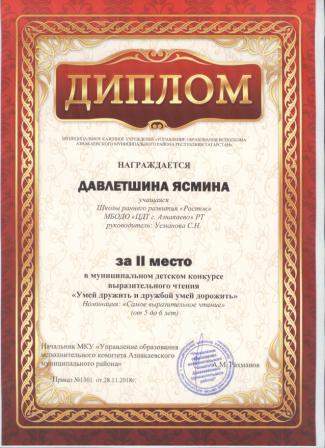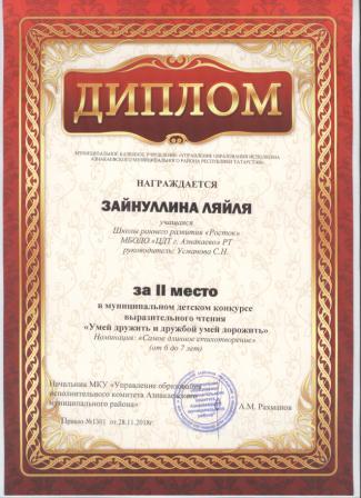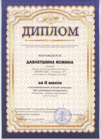 2 место в муниципальном детском конкурсе «По тропинкам математики» (Давлетшна Я., Шарифуллина Н.И.)