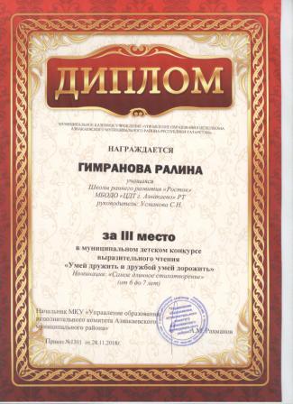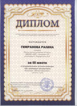 3 место в муниципальном детском конкурсе «По тропинкам математики» (Гимранова Р., Шарифуллина Н.И.)