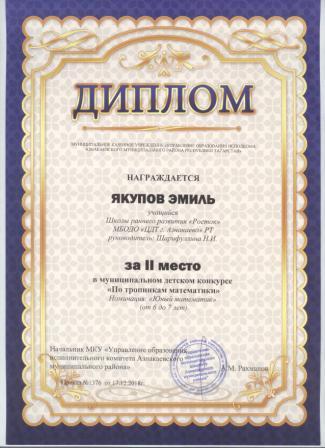 2 место в муниципальном детском конкурсе «По тропинкам математики» (Якупов Э., Шарифуллина Н.И.)