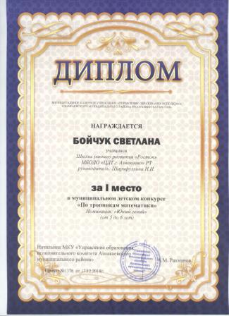 1 место в муниципальном детском конкурсе «По тропинкам математики» (Бойчук С., Шарифуллина Н.И.)