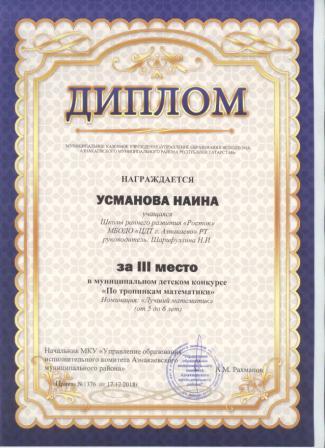 3 место в муниципальном детском конкурсе «По тропинкам математики» (Усманова Н.. Шарифуллина Н.И.)