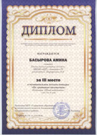 3 место в муниципальном детском конкурсе «По тропинкам математики» (Басырова А., Шарифуллина Н.И.)
