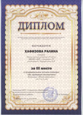 3 место в муниципальном детском конкурсе «По тропинкам математики» (Хафизова Р.. Шарифуллина Н.И.)