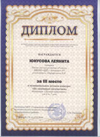 3 место в муниципальном детском конкурсе «По тропинкам математики» (Юнусова Л., Шарифуллина Н.И.)