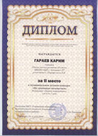 2 место в муниципальном детском конкурсе «По тропинкам математики» (Гараев К., Шарифуллина Н.И.)