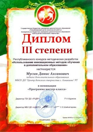 3 место в Республиканском конкурсе методических разработок (Мусин Д.)