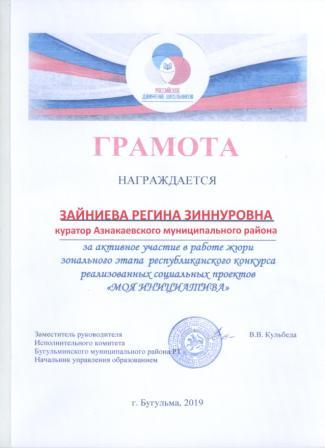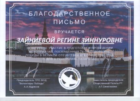 Благодарственное письмо за активное участие в подготовке и проведении мероприятий (Зайниева Р.З.)