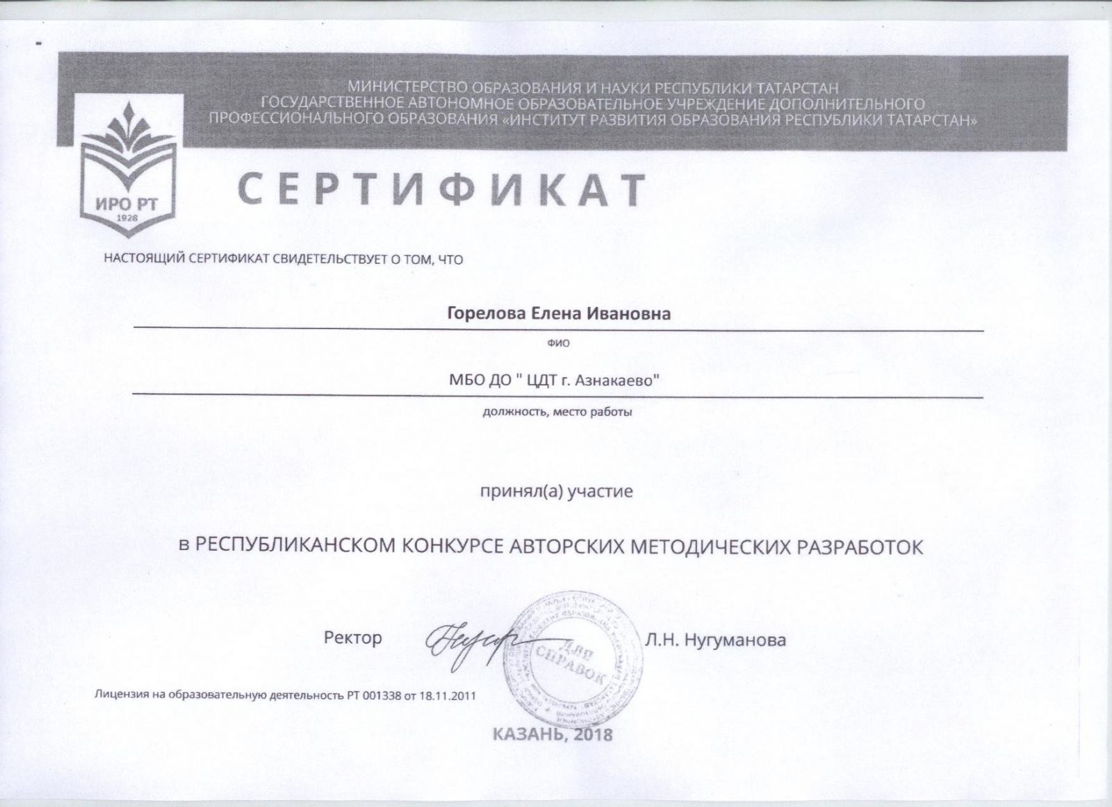 Сертфикат об участии в Республиканском конкурсе авторских методических разработок (Горелова Е.И.)