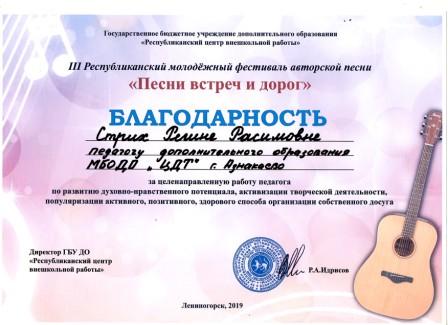Благодарственное письмо за личный вклад в патриотическое восптание детей и молодежи (Зиганшин Р.С.)