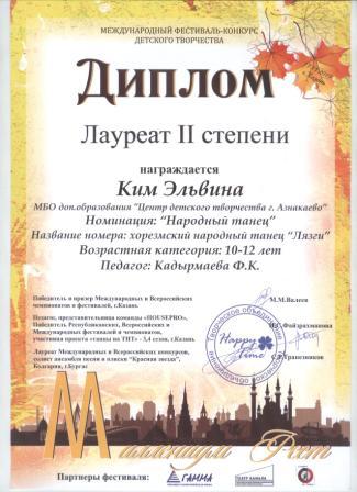 2 место в Международном фествале-конкурсе детского творчества (Ким Э., Кадырмаева Ф.К.)
