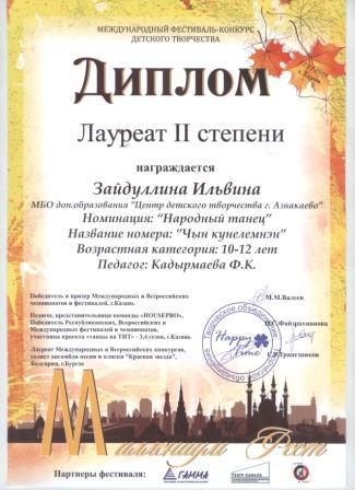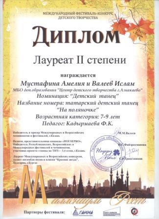 2 место в Международном фествале-конкурсе детского творчества (Зайдуллина И., Кадырмаева Ф.К.)