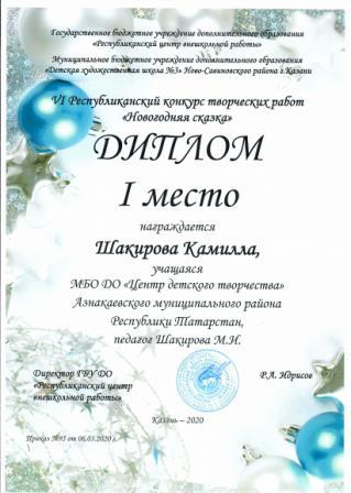 Диплом за победу на Республиканском конкурсе "Буду бдительным на льду" (Шакирова К., Шакирова М.И.)