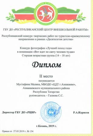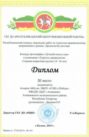 3 место в Республиканских соревнованиях – слет по спортивному туризму (Гариповаа В., Исмагилов Р.Р.)