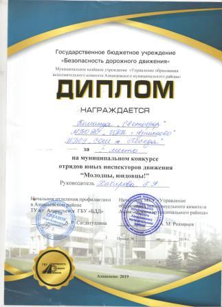 2 место в муниципальном конкурсе отрядов ЮИД "Молодцы, юидовцы" (команда "Светофор", Хабирова Г.А.)