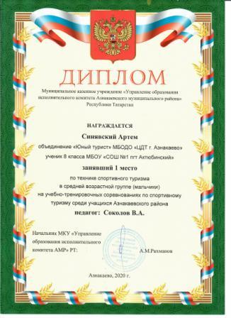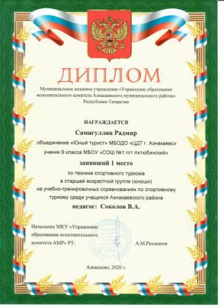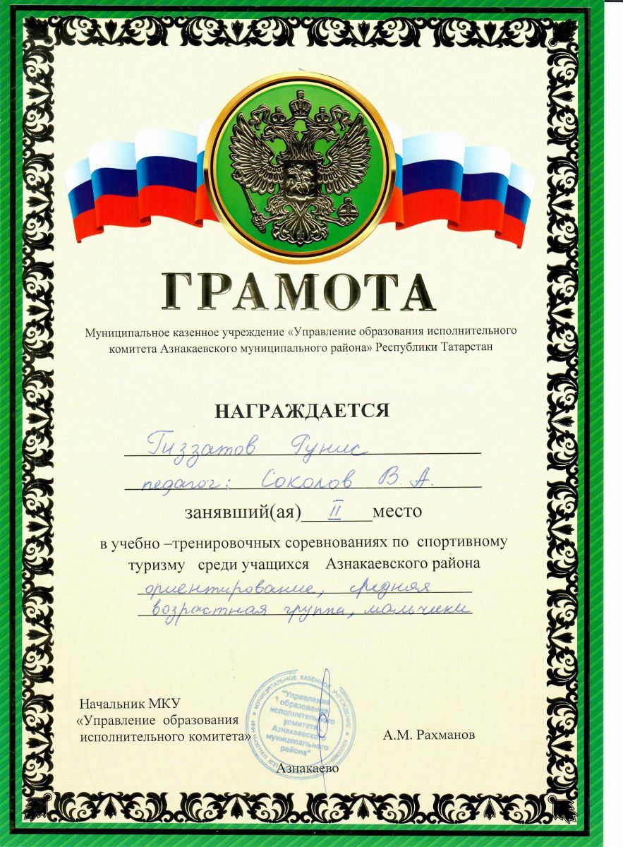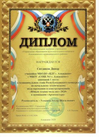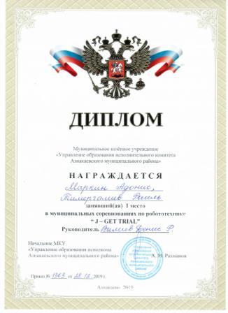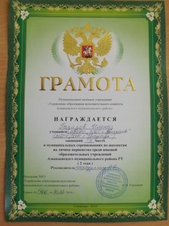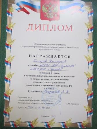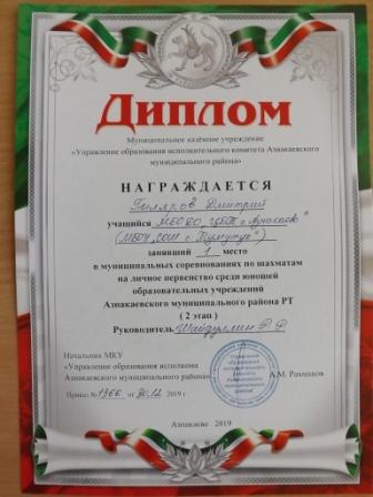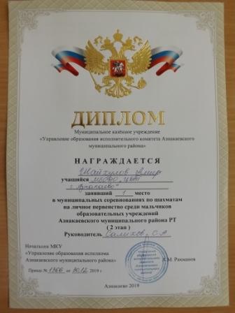 1 место в муниципальных соревнованиях по шахматам на личное первенство ("Каиссия", Салихов С.А.)