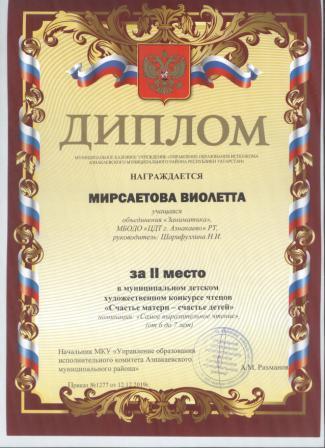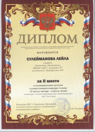 2 место в конкурсе патриотической песни "Память" (Мулюкова И,, Зарипова Л.И.)