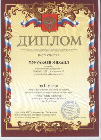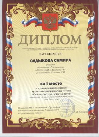 1 место в муниципальном конкурсе театральных масок «Радуга маскарада» (Мурзакаев М., Шакирова М.И.)