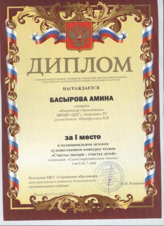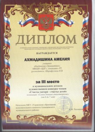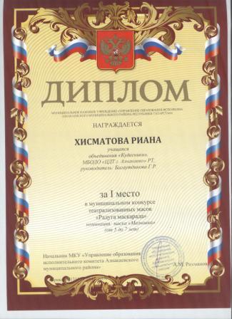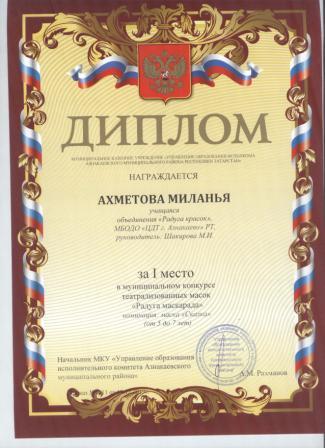 1 место в муниципальном конкурсе театральных масок «Радуга маскарада» (Ахметова М., Шакирова М.И.)