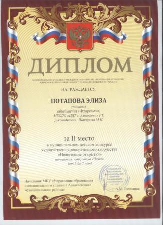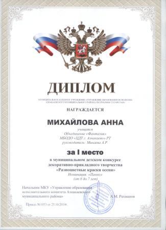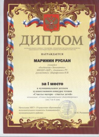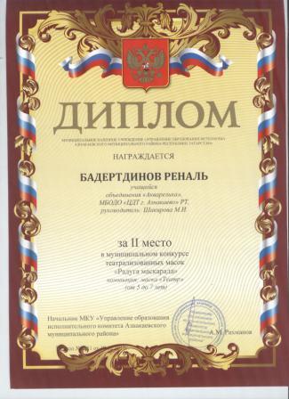 1 место в муниципальном конкурсе театральных масок «Радуга маскарада» (Шаехов А., Шакирова М.И.)
