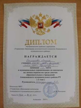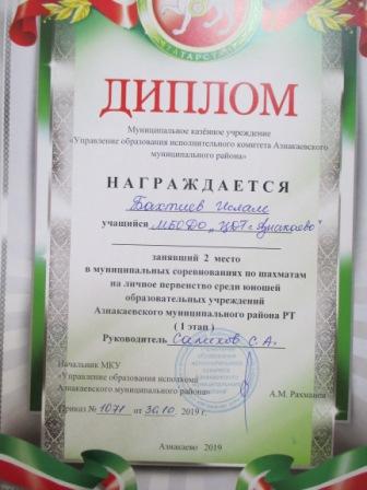 2 место в муниципальных соревнованиях по шахматам на личное первенство (Бахтиев И., Салихов С.А.)