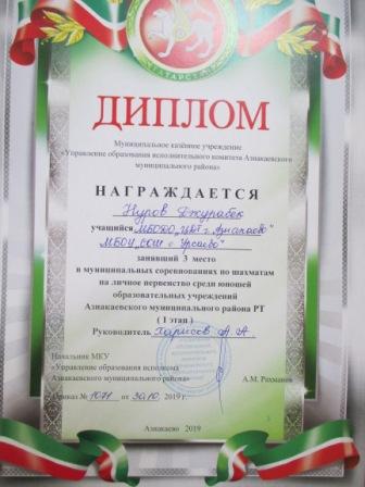 3 место в муниципальных соревнованиях по шахматам на личное первенство (Нуров Д., Салихов С.А.)