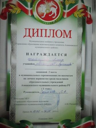 2 место в муниципальных соревнованиях по шахматам на личное первенство (Шайхулов А., Салихов С.А.)