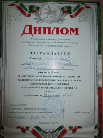3 место в муниципальных соревнованиях по шахматам на личное первенство (Гизетдинов А., Салихов С.А.)