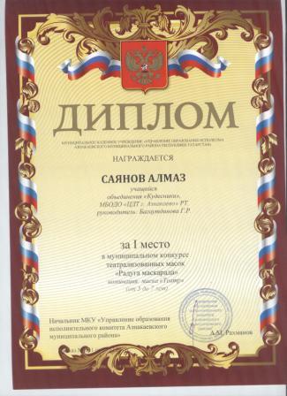 1 место в муниципальном конкурсе театральных масок «Радуга маскарада» (Саянов А., Багаутдинова Г.Р.)