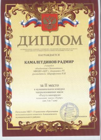 2 место в муниципальном конкурсе театральных масок «Радуга маскарада» (Миргасимов Р., Шакирова М.И.)